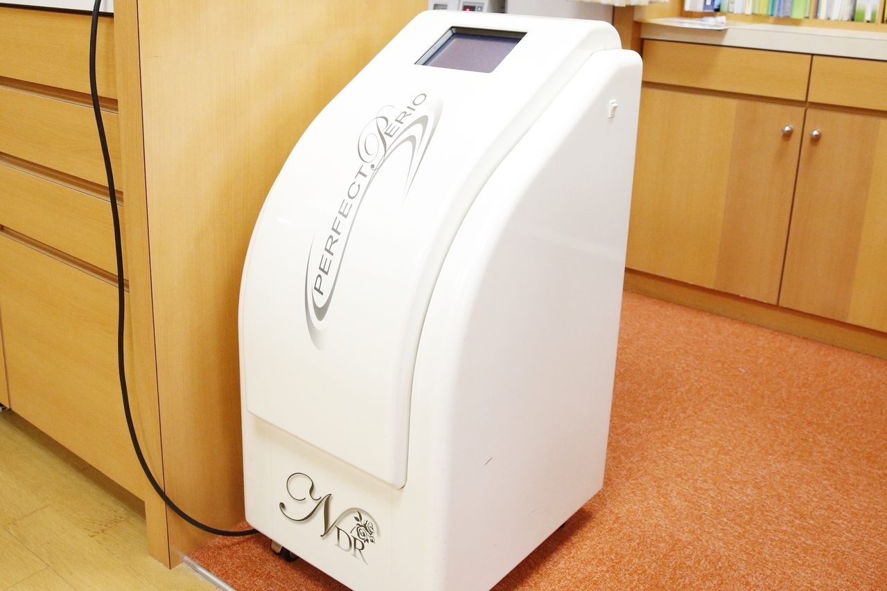 当院では、パーフェクトペリオ(次亜塩素酸電解水)というお口の中の虫歯菌や歯周病菌をほぼ完全に殺菌することができる洗浄水を導入しています。この殺菌効果で、なるべく歯を削らず、神経を取らなくてすむよう、患者さまの健康な歯が長持ちするための治療を行っております。